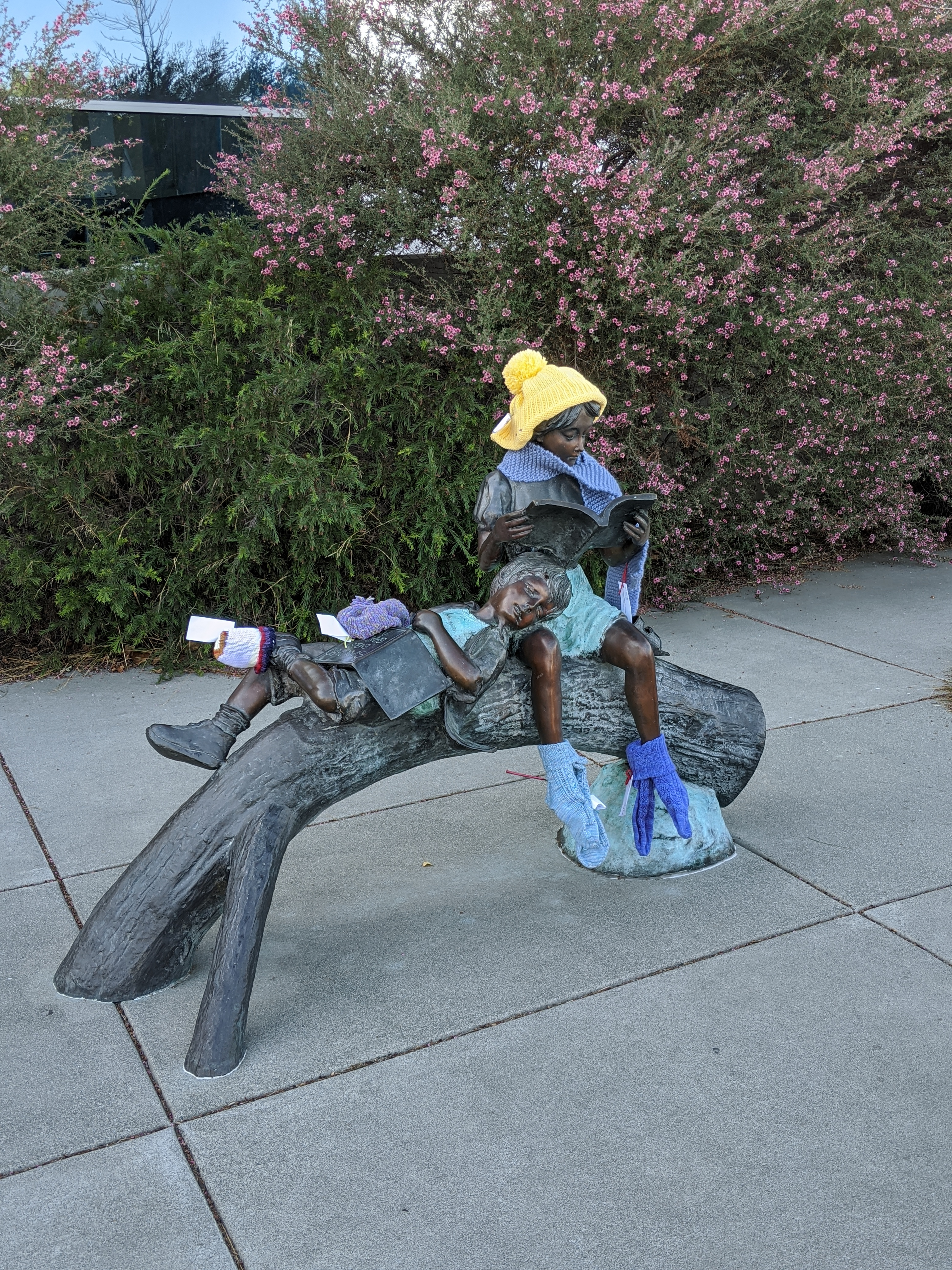 On distribution day, Paley and her team of “elves” go out first thing in the morning armed with bags of knitted goodies. They visit around 8-10 different sites—including the dog park on Main Street, Jardin de Niños Park, and the Redwood Shores Library branch—decking out fences, statues, and trees in yarn creations of all shapes and colors.