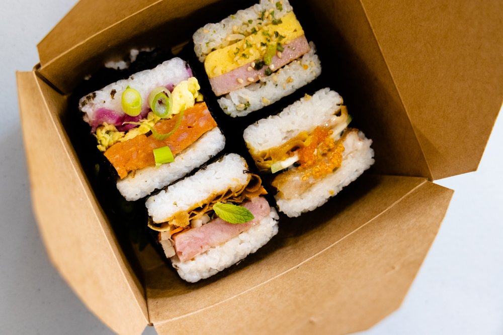 Miss Subi offers a selection of musubi, the Japanese-inspired snack ubiquitous in Hawaii. However, the truck goes beyond the most common form of musubi, a slice of spam wrapped together with rice in a sheet of seaweed, and incorporates fillings inspired by cuisines across Asia. The KBJ Beef Musubi pairs kimchee bacon jam with a beef patty, and a har gow-inspired musubi uses minced shrimp to imitate the dim sum dumpling.